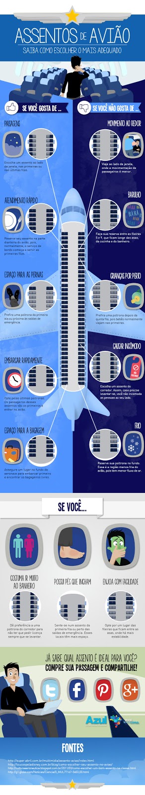 Muitas pessoas ficam em dúvida sobre quais os melhores assentos no avião, tais como qual o melhor lugar para sentar e ter uma viagem agradável. Os assentos do avião atendem algumas necessidades de acordo com sua posição na aeronave. O infográfico produzido visa indicar qual o melhor assento no avião de acordo com a necessidade de cada passageiro.